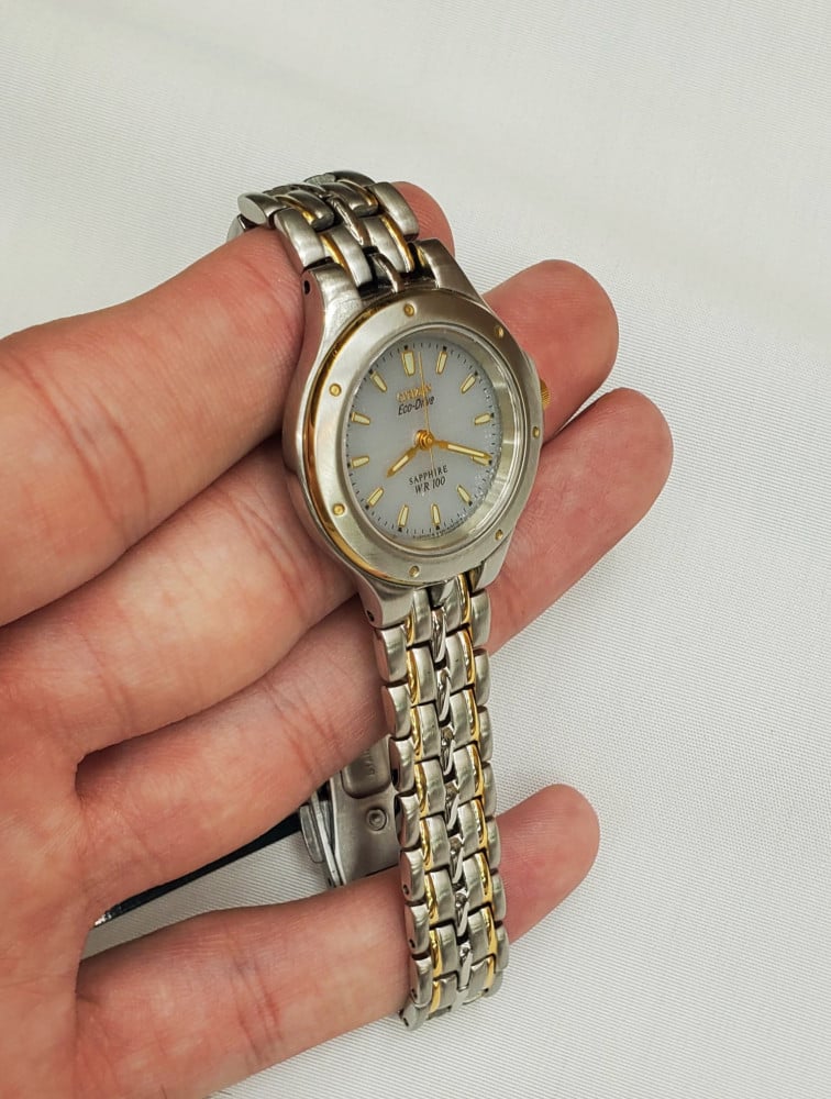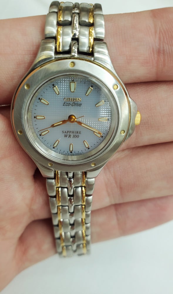 تتميز هذه الساعة من سيتيزن باللون الفضي والذهبي وبسوار ذات جودة عالية مصنوعة من الفولاذ المقاوم للصدأ (ستانلس ستيل) وهيكل مصنوع من الفولاذ المقاوم للصدأ (ستانلس ستيل) بمقاس 26ملم محمي بطبقة من الزجاج المعدني القوي وبحركة كوارتز الموثوقة ولدى الساعة مقاومة ضد الماء حتى 50 متر