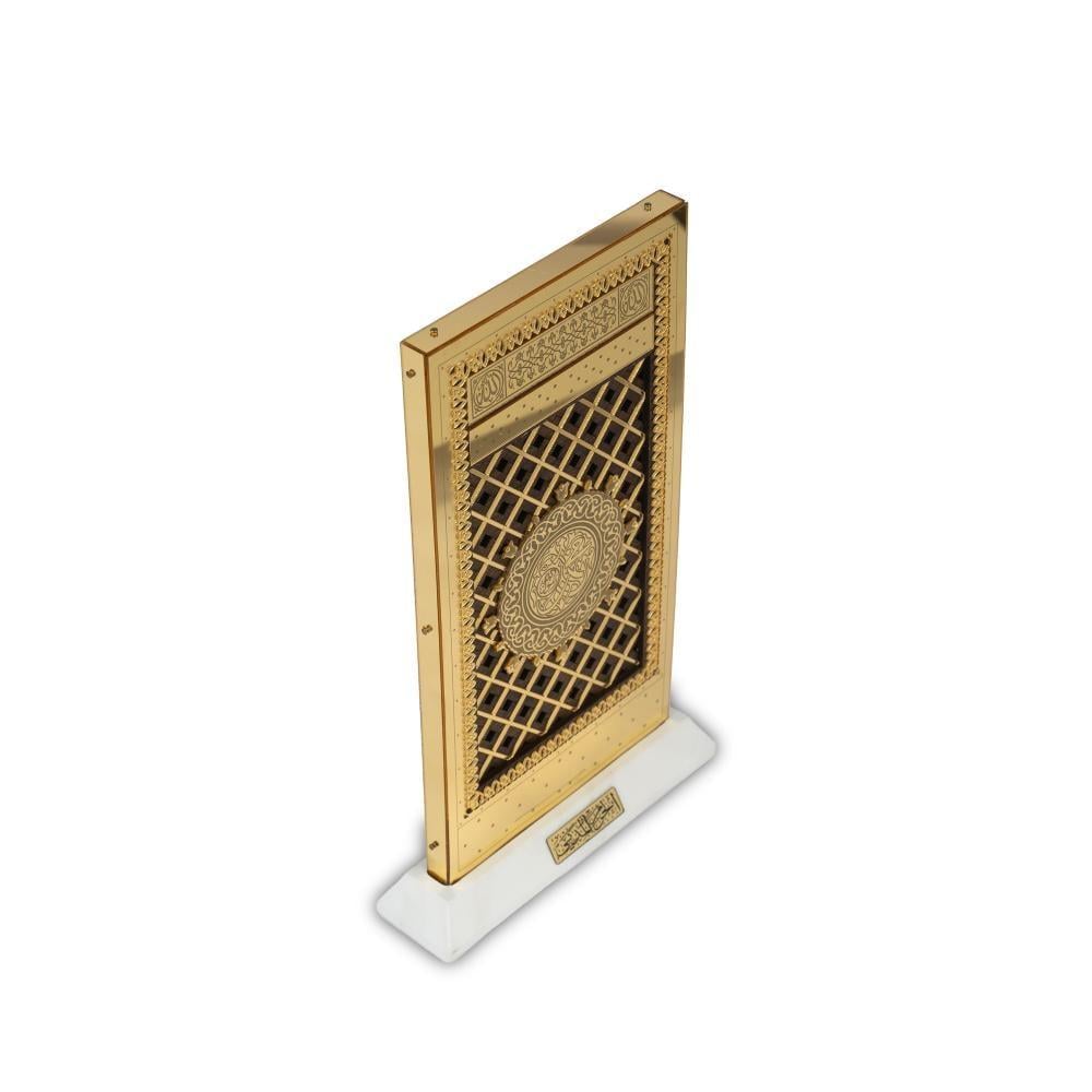 مجسم يمثل باب المسجد النبوي الشريف ويوضح التفاصيل الهندسية والزخرفية والكتابات التي عليه.صنع من مادة الإكليرك الذهبي الفاخر اللامع المطعم باللون البني الجميل.وصنعت العلبة من الجلد الأخضر الفاخر.مقاسات المنتج :الطول : 28.5سمالعرض : 16سم